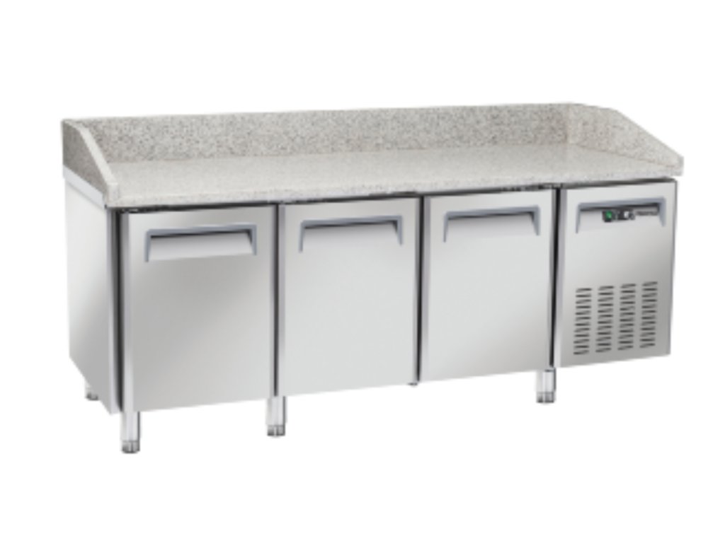 Profesionální chladící pizza stůl v nerezovém provedení s deskou ze žuly, s nuceným oběhem vzduchu, s elektronickým termostatem. Součástí stolu standardně 2 rošty.