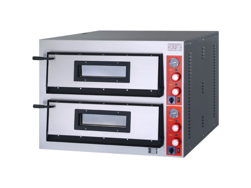 Dvoukomorová pizza pec, elektrická od výrobce GGF ze série F-Line. Kapacita: 8 x pizza Ø 360 mm. Přední panel je vyroben z nerezové oceli, opláštění vyrobeno z lakované nerezové oceli v černé barvě, šamotové desky ve spodní části komory, provoz do 500°C, osvětlení komory, odvětrávací systém páry, možnost samostatné regulace topnými tělesy, systém s více topnými tělesy.