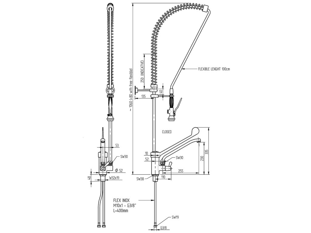 Baterie na umyvadlo od firmy Monolit je s otvorem na sprchu a výlevku na průměr trubek ¾. Díky flexibilnímu rameni lze snadno oplachovat nádobí či kuchyň. Je vyrobena z nerezové oceli. je vhodná na otvor s průměrem 33 mm. Délka výlevky je 28 cm.
