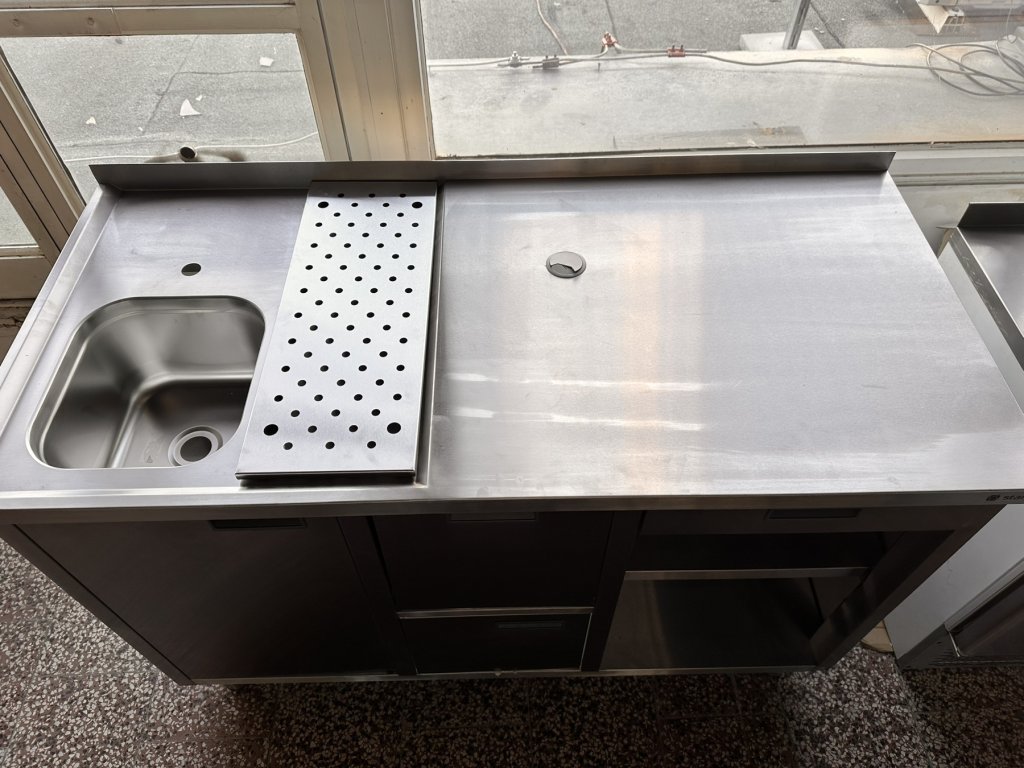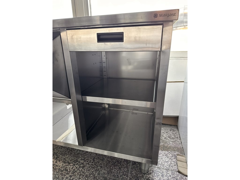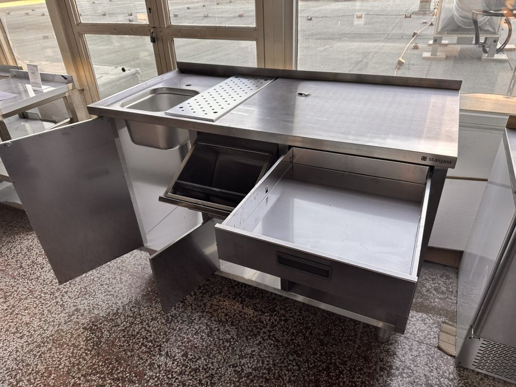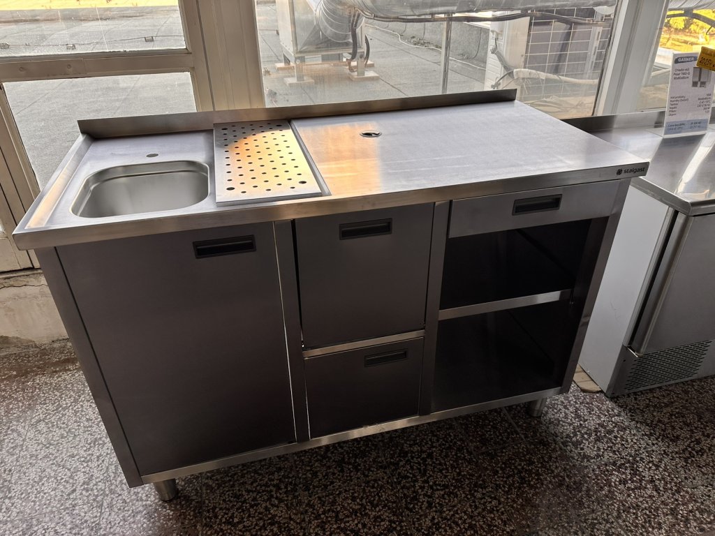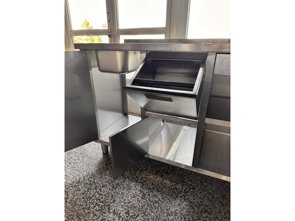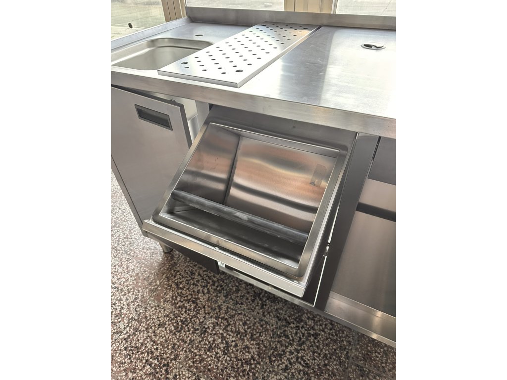 Stůl pod kávovar s šuplíkem a umyvadlem je celý vyroben z nerezové oceli. Má výsuvný šuplík s brzdou a odklepávačem na kávovou sedlinu, skříňku na filtr na změkčování vody, zásuvku na příbory, otvor v pracovní ploše stolu pro připojení kávovaru, umyvadlo s odnímatelným odtokem. Rozměry komory: 325 × 354 × 200 mm. Stůl je vhodný do kaváren, cukráren, hospůdek, restaurací a dalších gastronomických zařízení, kde se používá kávovar.